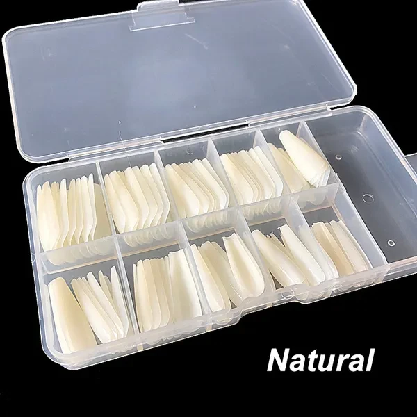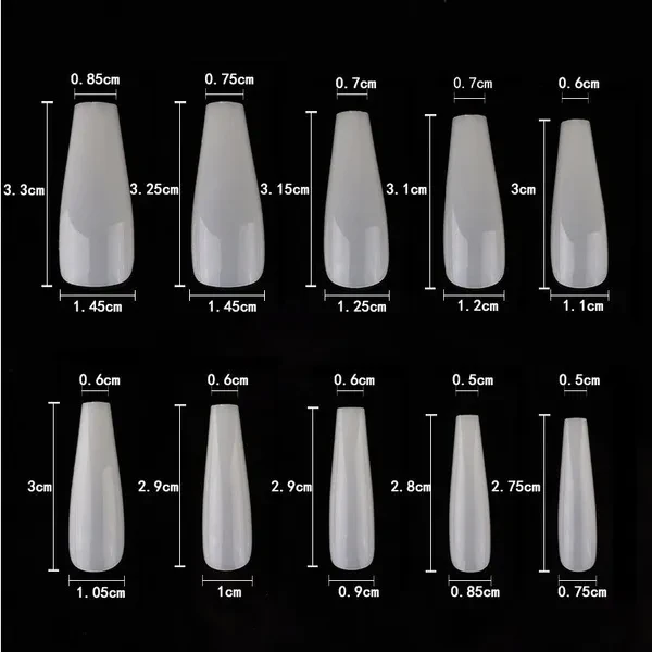 Quantity: 1 Box, 100 Pieces/box. Size: 10 sizes, 10 pieces for each size Shape: Coffin (Ballerina) Style: Full cover Length: Long Color: White, Natural, Transparent