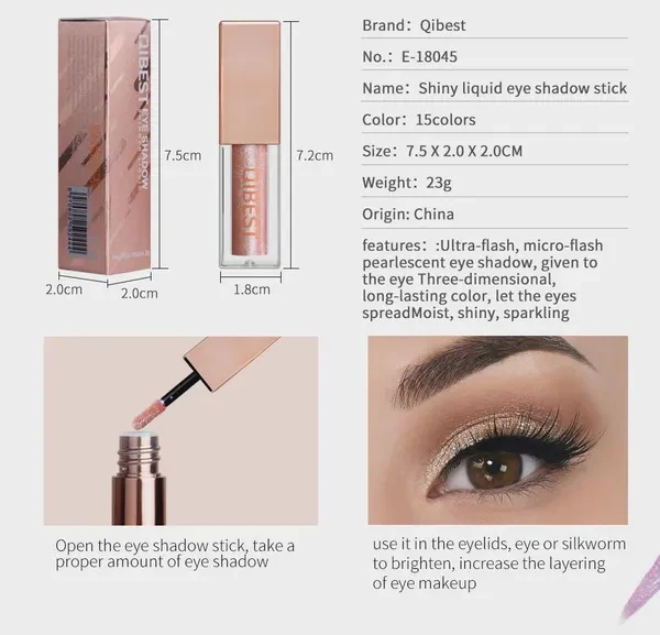 Specifications: Product Name: Liquid Glitter Eyeshadow Net Weight:4.2g Effect: Waterproof Long lasting Super Sparkly and Pigmented. Color:15 Colors for choose The application of skin: Suitable for all skin types Type: eyeshadow pallete тени палетки теней косметика maquiagem completa тени для глаз косметика для макияжа тени для век sombra Description: Portable and convenient to use. Flashing eyeshadow stick,rich and leading-the-trend colors. Perfect for both professional Salon or personal use! High quality ingredients with silky shine color, can last for all day long! The more you use, the more luminosity or bronze you ll get, allowing you to customize your glow. This Eyeshadow has all the colors you need to recreate sophisticated or edgy looks for day and night, for different occasions, casual, party, wedding! Package includes: 1x Colors Liquid Eye Shadow Stick Note: that due to lighting effect and computer color, the actual colors slightly different from the picture.