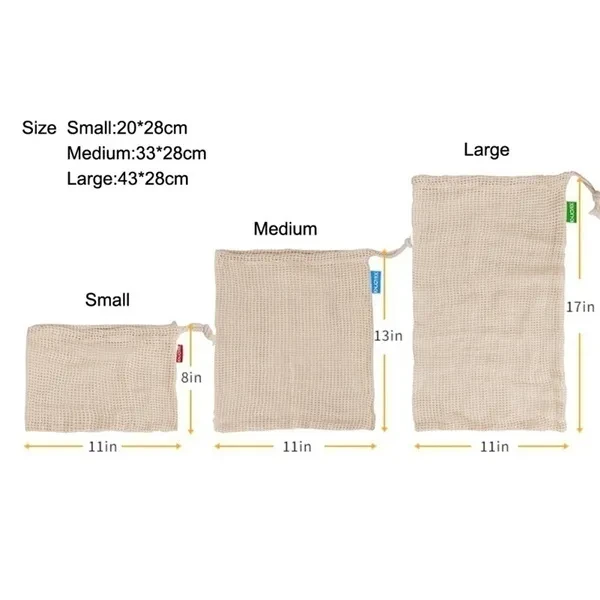 Product Size: Small 20*28cm/8*11in Medium 33*28cm/13*11in Large size 43*28cm/17*11in Material: cotton mesh + cotton rope Uses:storage, shopping Type :Vegetable Kitchen Storage Bag Theme :Home, Garden Package included: 1Pcs(S/M/L) Or 3Pcs(1Pcs-S +1Pcs-M +1Pcs-L) * Storage Bag​