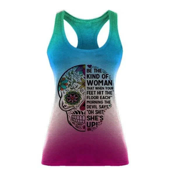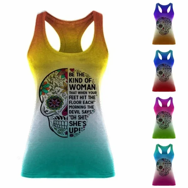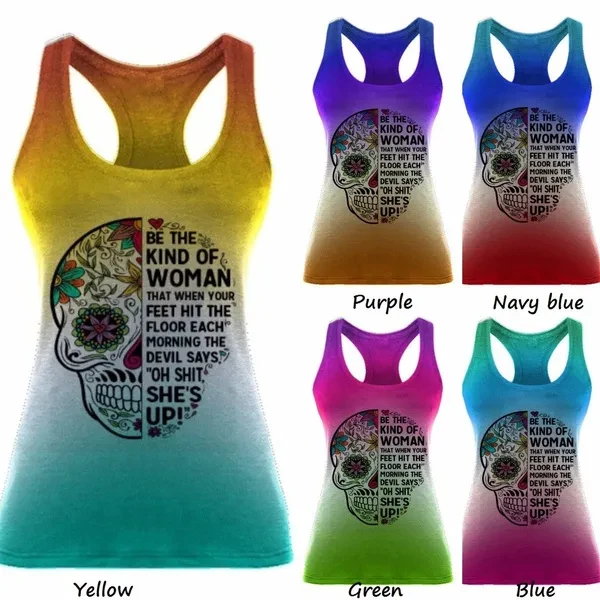 2020 New Fashion Cool Skeleton Print Sleeveless Tops for Women Gradient Color Rainbow Letter Printed Graphic Tee Shirts Summer Slim Tank Top Casual Cotton Sport Yoga Tops Plus Size 5XL