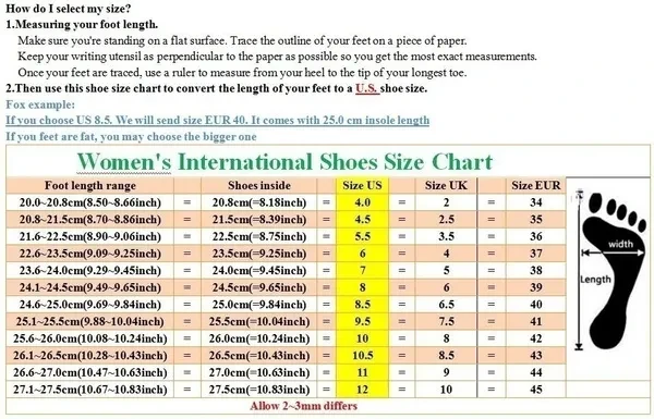 How do I select my size? 1.Measuring your foot length. Make sure you#39;re standing on a flat surface. Trace the outline of your feet on a piece of paper. Keep your writing utensil as perpendicular to the paper as possible so you get the most exact measurements. Once your feet are traced, use a ruler to measure from your heel to the tip of your longest toe. 2.Then use this shoe size chart to convert the length of your feet to a U.S. shoe size. Fox example: If you choose US 8.5. We will send size EUR 40. It comes with 25.0 cm insole length If you feet are fat, you may choose the bigger one Women#39;s International Shoes Size Chart Foot length range=Size US=Size UK=Size EUR 20.0~20.8cm(8.50~8.66inch)=US4.0=UK2=EUR34 20.8~21.5cm(8.70~8.86inch)=US4.5=UK2.5=EUR35 21.6~22.5cm(8.90~9.06inch)=US5.5=UK3.5=EUR36 22.6~23.5cm(9.09~9.25inch)=US6 =UK4=EUR37 23.6~24.0cm(9.29~9.45inch)=US7 =UK5=EUR38 24.1~24.5cm(9.49~9.65inch)=US8 =UK6=EUR39 24.6~25.0cm(9.69~9.84inch)=US8.5 =UK6.5=EUR40 25.1~25.5cm(9.88~10.04inch)=US9.5 =UK7.5=EUR41 25.6~26.0cm(10.08~10.24inch)=US10 =UK8=EUR42 26.1~26.5cm(10.28~10.43inch)=US10.5=UK8.5=EUR43 26.6~27.0cm(10.47~10.63inch)=US11=UK9=EUR44 27.1~27.5cm(10.67~10.83inch)=US12=UK10=EUR45 Allow 2~3mm differs product information: Shoe Width: Medium Platform Height: 0-3cm Decorations: Rhinestone Leather Style: Soft Leather Outsole Material: PVC Lining Material: Synthetic Heel Shape: Hoof Heels