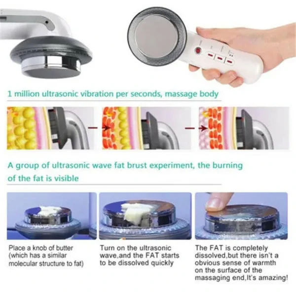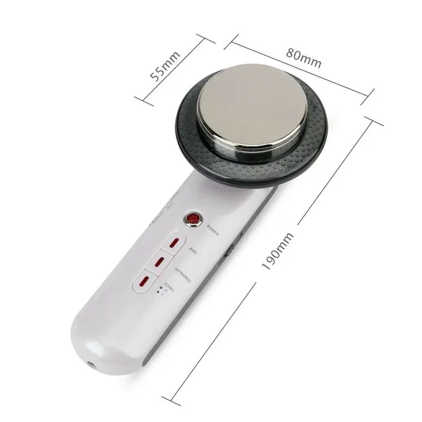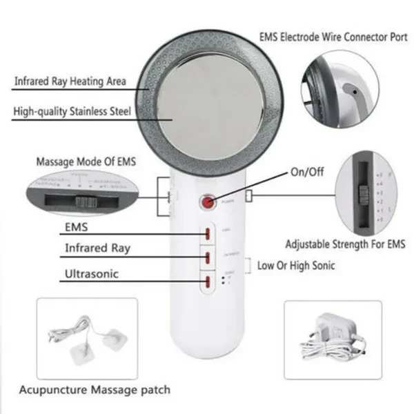 Function: EMS + Infrared + Ultrasonic Features: Effective ultrasonic facial and body beautifying beauty massager. EMS skin and body slimming and tonning machine.Skin rejuvenation infrared heat therapy device. Enhance skin texture, anti-wrinkle, helps fight fatty areas, tightens. Quickly and effectively reduce and give relief from severe chronic back pains, other sort of body aches. Regulate internal secretion and accelerate consuming of fat, realize the dreams of body slimming. Mini and stylish appearance, convenient to carry, easy to use. For both facial & body use. Specification: 1. Far infrared has following functions: The carbon fiber bundle surrounding the probe can generate far infrared ray with the wavelength ranging 8 -12μm. It can penetrate into deep skin, boost vigor of skin, activate cells and accelerate metabolism. 2. Ultrasonic have three main functions: It can change the capacity and movement of every cell with precise massage function which is named as cells massage. It can stimulate and adjust the cytomembrane, increase the permeability of epidermis, its thermal, physical and chemical effects can rise the temperature in deep skin by 0.5-1°C, promote skin to absorb essences, accelerate metabolism and reinforce the regenerative course of tissue. Ultrasonic can also decompose waste surrounding fat, consume energy, repair lymph and capillary vessels with weight losing and figure sculpting functions. 3. Micro current: Massage with micro current, stimulate the muscles with passive movement under current. Muscular movement consumes fat, sugar and carbohydrate of surrounding tissue. Under normal movement, muscle may consume 60-70 joule energy per second, but under high frequency movement, muscle can consume 3000-4000 joule energy per second. Package included: 1x 1MHz Ultrasound massager 1x Power adapter 1x Wire 4x Pads 1x English manual