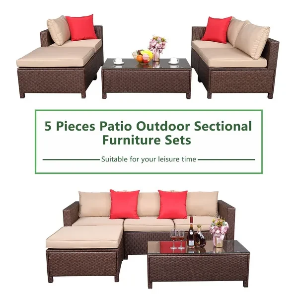 Introductions: Are you looking for a comfortable sofa set for your family? If so, this Oshion 5-Piece Set Rattan Sofa Hanging Legs 2 Corners 1Sofa Without Armrests 1 Foot Drag 1 Rectangular Coffee Table is highly recommended to you. Unlike normal leather sofa, this rattan sofa will give you a different using experience. Adopting high quality PE rattan , it features stable, sturdy and durable, which can meet your family daily demand. So what are you waiting for? Don't hesitate, it's worth buying! Features: 1. Made of high quality PE rattan, stable, sturdy and durable 2. It has a long service time, durable in use 3. The sofa set can meet your family need 4. Soft cushion ensures comfortable seating experience 5. Concise design and exquisite workmanship 6. It can coordinate with any style of decoration Specifications: 1. Material: PE Rattan Iron Sponge Polyester Cloth Tempered Glass 2. Color: Brown Wood Cane Beige Seat Cushion Red Pillow Transparent Glass 3. Product Specifications: Corner Sofa: Overall Size: (29.53 x 29.53 x 26.38)" / (75 x 75 x 67)cm(L x W x H) Seat Size: (25.59 x 25.59 x 14.37)" / (65 x 65 x 36.5)cm(L x W x H) Handrest Height: 67cm Armless Sofa: Overall Size: (25.59 x 29.53 x 26.38)" / (65 x 75 x 67)cm(L x W x H) Seat Size: (25.59 x 25.59 x 14.37)" / (65 x 65 x 36.5)cm(L x W x H) A Footstool: Overall Size: (29.53 x 29.53 x 14.37)" / (75 x 75 x 36.5)cm(L x W x H) Tea Table: Overall Size: (39.76 x 18.9 x 14.17)" / (101 x 48 x 36)cm(L x W x H) Thickness Of Seat Cushion: 8cm Cushion Size: 68 x 39cm Pillow Size: 42 x 42cm Glass Size: (39.37 x 18.5 x 0.2)" / (100 x 47 x 0.5)cm(L x W x H) 4. Product Load-Bearing: Tea Table: 110.23lbs / 50kg Sofa: 330.69lbs / 150kg A Footstool: 330.69lbs / 150kg 5. Weight: 19.62lbs / 8.9kg Package Includes: 2 x Corner Sofa 1 x Armless Sofa 1 x Footstool 1 x Tea Table 3 x Sofa Seat Cushion 3 x Sofa Cushions 2 x Sofa Pillow 1 x Footstool Seat Cushion 1 x Transparent Tempered Glass 1 x Hardware Assembly Parts 1 x English Instruction Manual