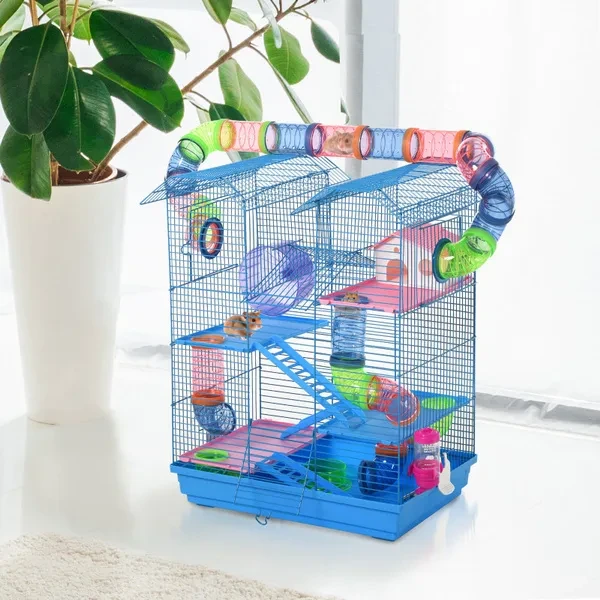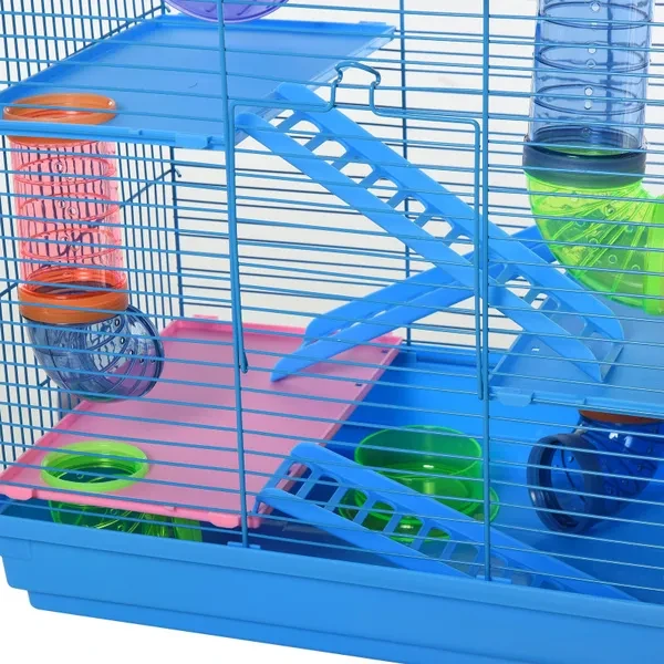 Descriptions Keep your small pets stimulated, safe and happy with a Multi-level indoor small animal cage kit. This animal-friendly design offers multiple platforms for exercise, fun, relaxation, and exploration for small pets like hamsters, mice, gerbils, etc. This hamster cage starter kit includes the main habitat, water bottle, food dishes, and exercise wheels. Play tubing system promotes activity and allows your small pet to move freely. Features - This cage offers multiple platforms for exercise, fun, relaxation, and exploration for your lovely pet. - Includes a small house on the perch, water bottle, food dishes, ladder and exercise wheels - Play tubing system promotes activity and allows your small pet to move freely - The front door allows you access to your hamster easily - Multiple levels design provides plenty of space for activities - The Internal accessories can be placed freely - Simple assembly required Specifications - Color: Blue - Material: Metal, PP, PS - Overall Dimensions: 18.5"L x 11.75"W x 23.25"H - Bottom Tray Size: 18.5"L x 11.75"W x 2.75"H - Door Size: 6" x 5"H - Perch Size (4 perches): 11"L x 6" - House Size: 6.25"L x 3.5"W x 3.5"H - House Door Size: 1.75"L x 2" - Ladder Size: 8.75"L x 2.25" - Exercise Wheels Size: Φ5" x 3.25" - Dishes Size:Φ3.25" x 1.5"H - Water Bottle 80ml - Tube Size: Φ2.25' - Net Weight: 9lbs.