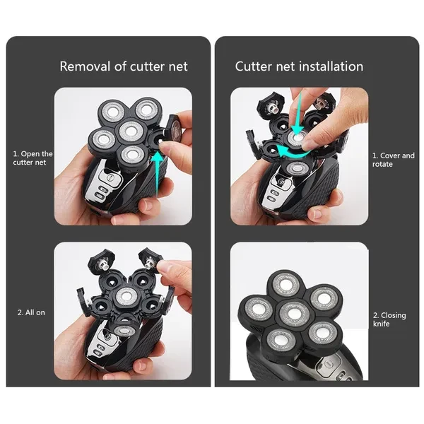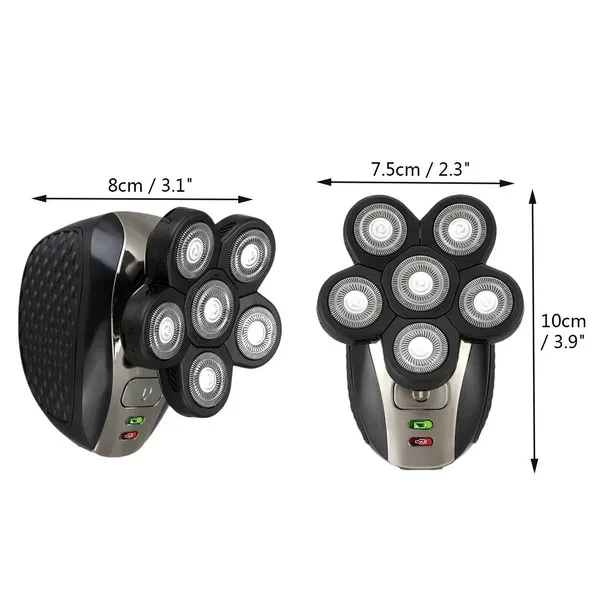 Package Includes B 1 * Host 1 * Razor 3 * Comb 1 * Massager 1 * Hair Clipper 1 * Cleaning Brush 1 * Protective Case 1 * Nose Hair Device 1 * Soft Face Sponge 1 * USB Charging Cable ------------------------------------------------------------ Features : ● 6D 6 cutter head The 6 blades fit smartly, without fear of short stubbles, quickly capture and stabilize the shave, and the blade feels smooth and elastic, adapting to different facial contours ● Ultra-thin double ring veneer knife net Double-ring veneer knife net increases the contact area by 50%, and the cambered knife net closely adheres to the facial contour, effectively shortening the shaving time ● USB charging plug It can be used while charging, and it supports USB port charging such as mobile phone 5V charger, car, laptop, etc. ● Lithium battery lasts long Strong battery life, charging indicator light, charging status is always known, traveling without a charger, 2 minutes a day, about 45 days ● 6 cutter head Fine trimmer to create temple & beard shapes, showing the charm of a refreshing man ● IPX6 full body waterproof The razor is water-resistant and can be rinsed directly with the whole machine. It is easy to clean. You can also apply shaving foam to soften your beard before shaving ● One machine for five uses Detachable cutter head, razor, hair clipper, nose hair device, cleansing brush, massager, create a variety of attractive shapes Specifications : Style(Option): Five in one / Single six cutter head accessories Power: 5W Charge: 2h Expend: 90min Voltage: 3.7V Waterproof: IPX6 Host Size(L * W * H): About 7.5cm * 8cm * 10cm / 2.3 * 3.1 * 3.9