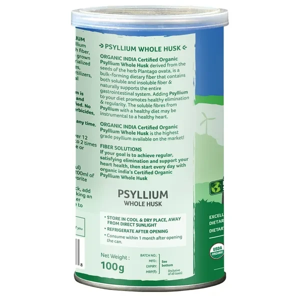 A TATA Product - Organic India Isabgol Whole Psyllium Husk Powder - 100g, With Dietary Fiber, Supports Heart Health & Digestive System, Gluten Free, Non-GMO Project Verified, NPOP & USDA Certified