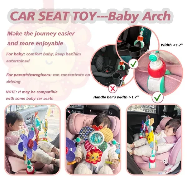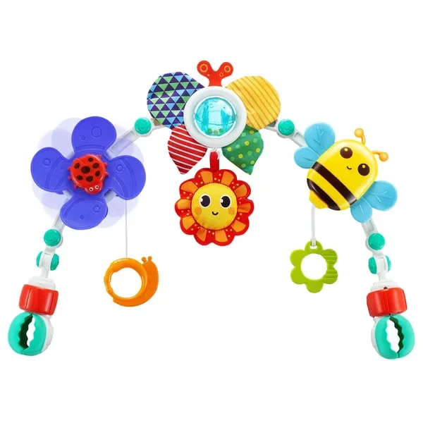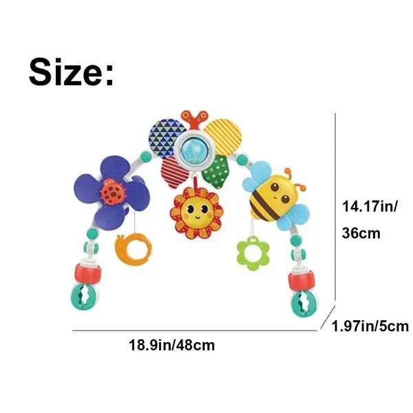 Versatile Baby Stroller Arch Toy - The features of this baby arch toy attachment are animal theme, colorful, rattles, wrinkles and adjustable. Bright colors that keeps baby engaged. The interactive and sound functions of toys create a vibrant and joyful atmosphere. The rattles and crinkles add playful elements, keeping babies entertained and occupied Baby Toy bar with Take-apart Elements - The bee toy and sun flower can be took off to entertain the baby directly. The sun flower that can make a whistling sound when it is squeezed. When baby grabs the toy ring linked to the bee, the bee's wings will flutter! More playful element awaits toddler to explore It is good for baby's early education, promote their abilities of fine motor skill, concentration, and brain development Attaching to Various Baby Gears - It is easy to attach our toys to strollers, bassinets, pram, crib, car seat and pushchair. The clips can be tighten to hold well on the stroller bar. You can adjust the height and angle to reach the suitable size for baby to grab and play with. Good for exercising baby's hand-eye coordination and grasp ability Ideal Choice, Especially for Outdoor Travel- A wonderful toy for your little one! It can easy attract baby's attention during travel and keep her/him entertained for a while, making travel a more enjoyable experience for both baby and caregiver. This stroller arch toy is suitable for birthday, holiday, travel and daily occassions