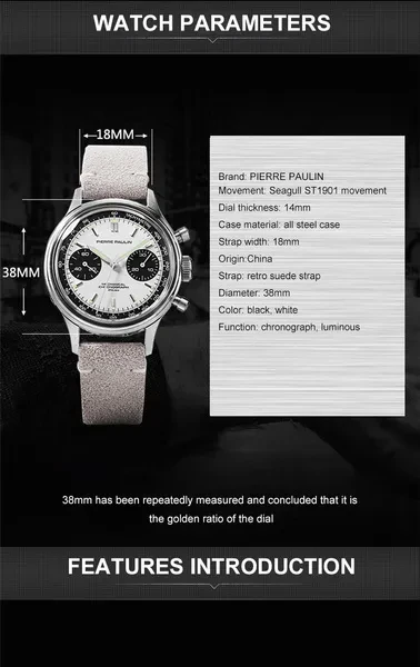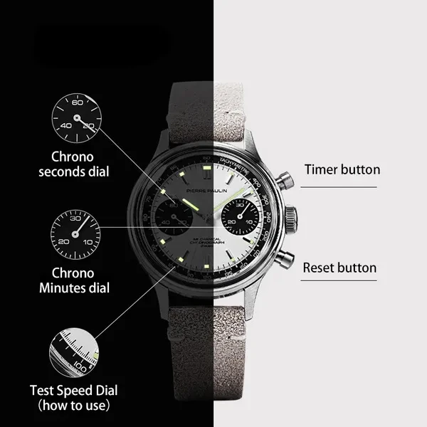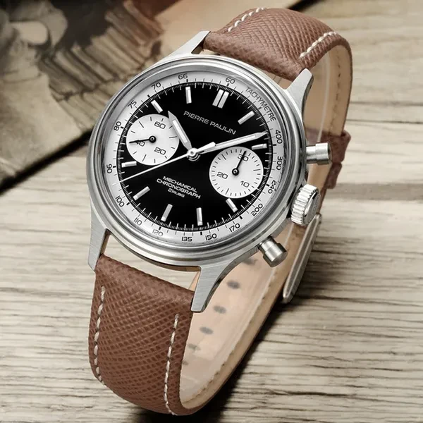 Item:Panda Acrylic Chronograph Brand Name: Merkur Movement:Original ST19 seagull movement with Gooseneck Movement Model: With Swan-neck Regulator Movement: Mechanical Hand Wind Dial Diameter: 38mm Band Width: 18mm Case Thickness: 14mm Band Length: 23cm Case Material: STAINLESS STEEL Band Material Type: Genuine Leather strap Feature: Stop Watch,luminous,Chronograph,Water Resistant,luminous hands Model Number: 1963 Panda Case Shape: ROUND Dial Window Material Type: Acrylic Boxes & Cases Material: Plastic Water Resistance Depth: 3Bar Origin: CN(Origin) Clasp Type: Buckle Style: Fashion & Casual