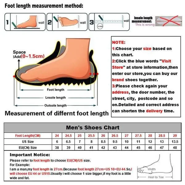 size: Please note. Simple packaging, in order to better protect the shoe CN/EU 39= US 6.5= Foot Length 245mm CN/EU 40= US 7.0= Foot Length 250mm CN/EU 41= US 8.0= Foot Length 255mm CN/EU 42= US 8.5= Foot Length 260mm CN/EU 43= US 9.5= Foot Length 265mm CN/EU 44= US 10 = Foot Length 270mm CN/EU 45= US 11 = Foot Length 275mm Size:39,40,41,42,43,44,45 Why buy from us? Worldwide fast shipping! Free tracking number! Quickly and satisfying communication! Unique high-quality goods! Best prices! Please reference our size picture carefully! Measured by hands, please allow 1-3mm error! Due to computer monitor, may exist some color error, please do not mind!