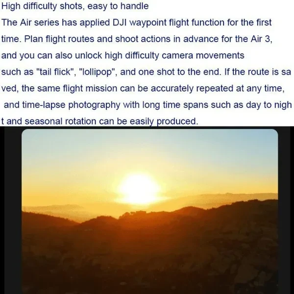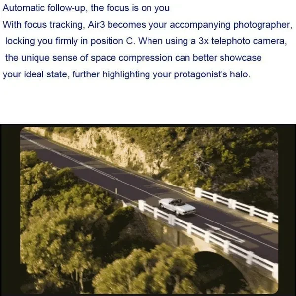 2 battery pack with screen remote control Empty weight: 0-1.5kg (inclusive) Product number: D-JI AIR 3 Ability cultivation: visual and intellectual development, hands-on and brain training Applicable audience: unlimited Special feature: medium to long focus Packaging: Color box Maximum flying altitude: above 120 meters (excluding) Origin: China Channel: 4 channels Applicable age: Youth (15-55 years old) 3C configuration category: Toys aged 14 and above Toy material: plastic Size: Below 30cm Takeoff total weight: 250g (inclusive) -1.5kg (inclusive) Is it a cross-border export exclusive source of goods: No Remote control method: handle Type: Aircraft 24mm equivalent focal length F/1.7 aperture 48 million pixels 4K/60fps HDR video 10-bit D-Log M/HLG color mode
