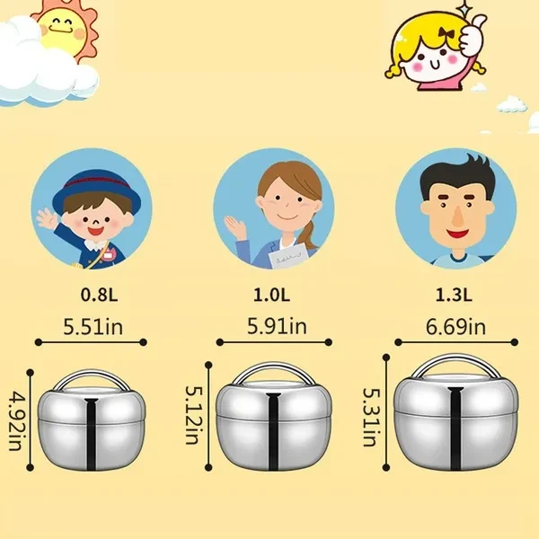 Description: *Double Layer Stainless Steel Insulated Lunch Box Thermal Student Food Container *Made of food grade stainless steel (non-magnetic) to ensure health and safety, easy to clean *Perfect design, exquisite and lovely, stylish and elegant, delicate texture, beautiful curve *With handle to prevent hand burns, easy to carry *Double layer insulation structure with heat insulation and cold protection function *It is widely used for office workers, student buffet lunches and outdoor picnics Specifications: *Material: Stainless Steel *Color: Silver (Random Handle Position) *Capacity: 800ML/1000ML/1300ML *Insulation duration: 2-3 hours (Approx) Package Contents: 1*Lunch Box Note: 1. The real color of the item may be slightly different from the pictures shown on website caused by many factors such as brightness of your monitor and light brightness. 2. Please allow slight manual measurement deviation for the data.