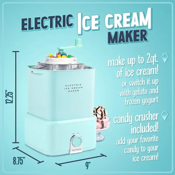 2 QUART CAPACITY: Makes up to 2 quarts of ice cream, frozen yogurt or sorbet at a time CANISTER & DASHER: Mixing dasher and 2-quart aluminum canister work together to make smooth, creamy ice cream DURABLE MOTOR: Durable bottom-drive electric motor does all the churning - no manual effort DETACHABLE BUCKET: Detachable ice cream bucket keeps ice cream cold when ready to serve CANDY CRUSHER Hand crank candy crusher breaks up your favorite mix-ins and candy pieces to customize ice cream EASY TO CLEAN: Plastic interior​ makes cleanup quick and simple CORD STORAGE: Stows away neatly for tidy storage