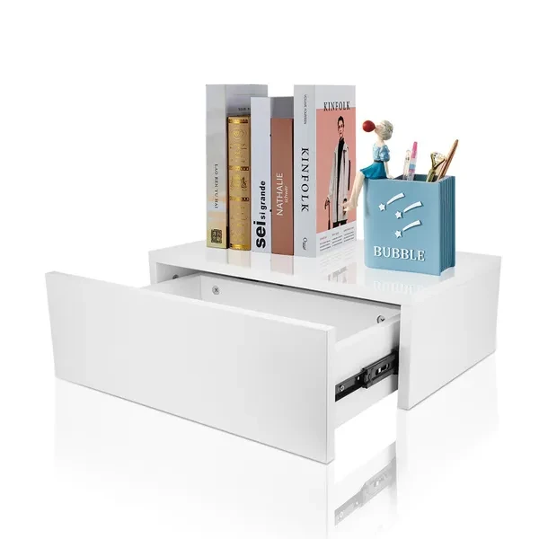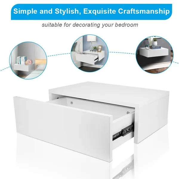 1. Floating bedside table, simple and stylish, exquisite craftsmanship, suitable for decorating your bedroom. 2. The desktop can be placed alarm clock, mobile phone, light, photo frame and other decorations. 3. Made of high‑quality MDF material, sturdy and durable, wear‑resistant, and has a long service life. 4. With a seperate drawer, can store wallets, keys, books, remote controls and other items. 5. Easy to assemble, can be directly installed on the wall, saving space, suitable for bedroom use. Specification: Item Type: Beside Table Material: MDF + Pine Wood Color: White Load-Bearing: 25kg / 55.1lb Weight: Approx. 7250g / 255.7oz Product Size: Approx. 30x46x15cm / 11.8x18.1x5.9in Package List: 1 x Floating Beside Table 2 x Guide 1 x Accessories Kit 1 x Manual Note: 1.Please kindly note that this product needs to be assembled by yourself. 2.Please allow 0‑1 inch error due to manual measurement. Thanks for your understanding. 3.Monitors are not calibrated same, item color displayed in photos may be showing slightly different from the real object. Please take the real one as standard.