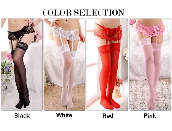 Sexy Garter Belt Stocking Set Women Stockings Sheer Net Lace Tighs Top Over Knee Erotic Nylons Lingerie Garter Pantyhose Size:Free Size Material: Lace +Spandex Color: black white red pink Package includes: 1 x Sexy Stockings 1x Garter Belt NOTE: 1. Please note the photo does not show actual size, please refer to Description for size details. 2. Please allow 1-3 mm differences due to manual measurement, thanks. 3. Due to the difference between different monitors, the picture may not reflect the actual color of the item.