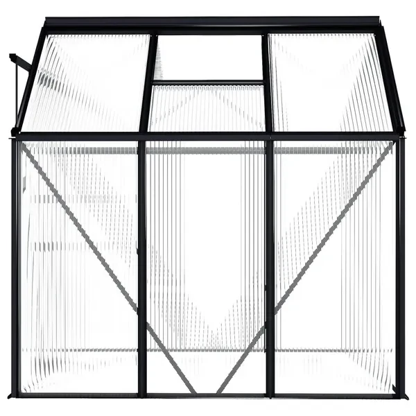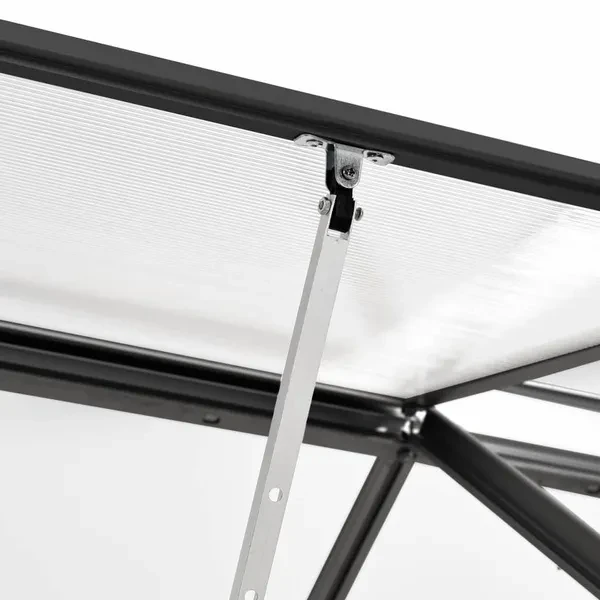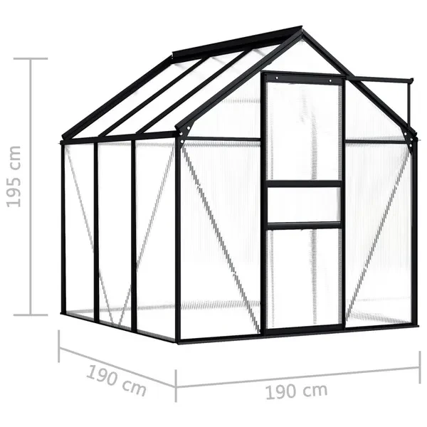 This spacious greenhouse has a total surface of 3.61 m². It can accommodate a considerable number of plants, and will be a great solution for protecting your plants from the cold weather. Made of polycarbonate panels, this solid greenhouse is UV resistant and thermally insulated. The greenhouse has a sturdy and maintenance-free aluminium construction for extra stability. The gutter system effectively allows water drainage, and the roof vent ensures optimal ventilation on hot days. Roof panels are fixed with metal clips, ensuring its durability and long-term use. Our greenhouse is easy to assemble. Please note the foundation is not included; and the roof of our greenhouse cannot withstand heavy snowfall. Colour: Anthracite and transparent Material: Aluminium, polycarbonate Dimensions: 190 x 190 x 125/195 cm (L x W x H) Ground surface area: 3.61 m² Capacity: 5.776m³ Panel thickness: 4 mm UV resistant Assembly required: Yes