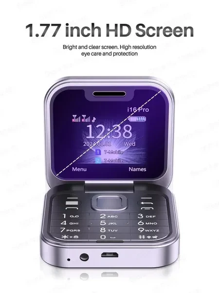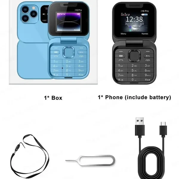 Model : i16 Pro Screen Size :1.77 inch HD Screen Phone Size : 63mmX63mmX18.8mm /118.3X63X12mm Phone Weight :80g (Including battery) Battery : 1000mAh Battery Phonebook : 500 Phone SMS: 90 Camera : Rear Camera SIM Card Quantity :2 Nano SIM card and 1TF card Memory Card : 32Mb RAM , 32Mb ROM , Maximum support 16GB expansion (The system will occupy part of the memory,It is recommended to install a memory card before using the phone) Charging Interface Type :Micro USB V2.0 Network 2G : GSM850/900/1800/1900 Features Dual SIM Card Simultaneous use of 2 nano SIM cards and 1 TF card. Easy to answer phone calls Foldable Phone It is only the size of powder when folded. Fashionable item that easily fits into your pocket Rear HD Camera Rear mounted high-definition camera. Convenient recording of the beauty life whether videos or photos LED Flashlight Power saving, and strong brightness. Long press the middle button to quickly turn on the torch. Music / Video Player Can play videos and music stored on your phone without the need for network loading, ready to play at any time Speed Dial You can set speed dial contacts (number keys2-9) . Simply press and hold the number keys to quickly dial the phone number of the person in contact, improving the efficiency of the call FM Radio Listen to various music, news, entertainment, and interview programs anytime and anywhere. Blacklist Adding phone numbers to the blacklist can effectively avoid the interference of these calls and text messages. 1.77 inch HD Screen Bright and clear screen. High resolution, eye care and protection Magic Voice Men, Women, Child sound. Make your voice chat more interesting and can also be used for some special occasions 3.5mm Headphone Jack Paired with exclusive wired headphone jack, charging and listening to music are both compatible More Practical Features Calculator, calendar, games, alarm clock, Bluetooth, recorder, etc. Both practical and convenient. Language English, French, Spanish, Portuguese,Italian, Russian, Arabic, Hebrew Package 1* Phone (include battery)