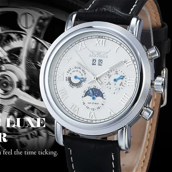 Item Type: Mechanical Wristwatches Feature: Complete Calendar,Luminous Hands,Moon Phase Band Material Type: Leather Water Resistance Depth: No waterproof Dial Window Material Type: Glass Movement: Automatic Self-Wind Clasp Type: Buckle Brand Name: JARAGAR Case Material: Stainless Steel Packing Including: -1*Mechanical Watch -1*Gift Box -1*Instruction Thanks for visiting our sotre~