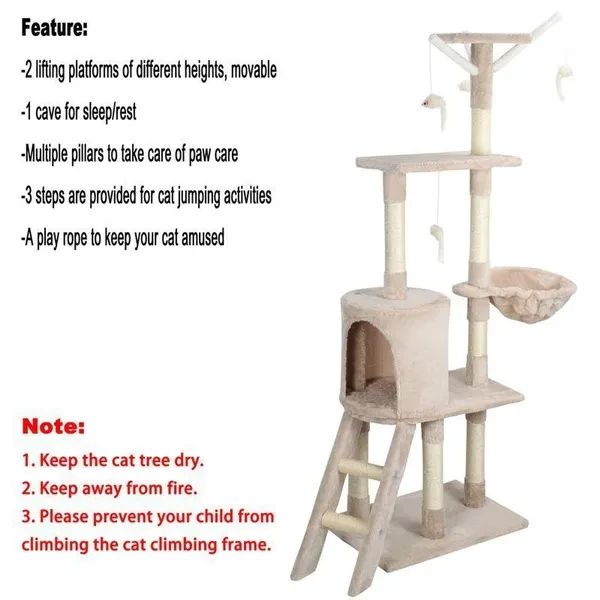 color: grey Material: E1 particleboard, sisal rope Board: Pressed wood board Type: Grab post Product size: 50 * 35 * 143cm note: 1. Keep the cat tree dry. 2. Keep away from fire. 3. Please prevent your child from climbing the cat climbing frame. packing list: Cat climbing frame assembly set * 1