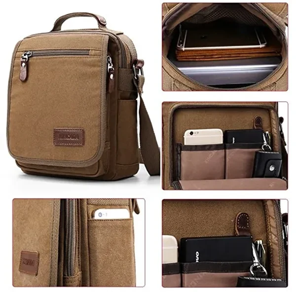 ➤Features: Main material: This shoulder bag is made of high quality cotton canvas, and decorated with PU leather and hardwares Capacity:Cell phone, mini-iPad(9"), wallet, umbrella, keys, and so on, this messenger bag is suitable for traveling, business, gift giving, outdoors and even school life Structure:Inner space of this shoulder bag:1 zipper mesh pocket and 1 zipper pocket. Outer space:Zipper closure. 1 zipper flap pocket, one zipper vice pocket, 2 side pockets and 1 zipper pocket in the back of this bag. 2 small pencil pockets, one pocket for your cell phone 1 special design for your keys in the vice pocket.