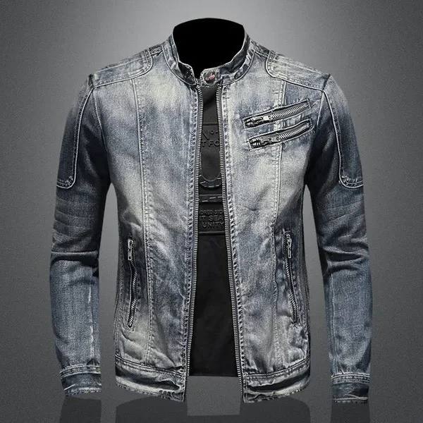 Men's Fashion Denim Jacket Casual Retro Denim Tops Stand Collar Zipper Jacket Cycling Motorcycle Suit Spring and Autumn Denim Jacket for Men