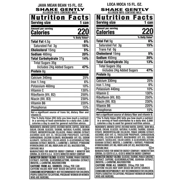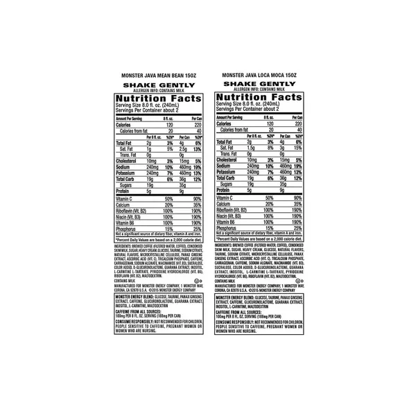 Delivery is not available to Puerto Rico, HI, AL,AE, APO/FPO or PO box addresses Highlights:- Java Monster coffee-flavored energy drink Energy drink to help you stay ahead and perform better 2 great coffee flavors with Monster's energy-boosting 188 mg of caffeine per can plus B vitamins About this item Product details Specifications Stay energized with the Monster Java Variety Pack. It offers a cool and creamy alternative to the typical coffee dribbled out by a noisy machine. Each pack contains two Monster Java flavors to keep things interesting. Who Makes Java Monster Drinks? These tasty drinks are produced by Monster, one of the leading energy drink brands in the world. Monster strives to craft chilled energy drinks that are delicious, convenient and of course, made with caffeine to energize the body and mind. Monster coffees are made to be enjoyed chilled, making them great for those who prefer cold coffee year-round or just as a refreshing summertime treat. They're a staple in homes, offices and convenience stores across the country. What's in the Monster Java Variety Pack Each pack contains 12 cans of Monster Java flavors—six Mean Bean® and six Loca Moca®. Monster coffee energy drink cans are easily portable as well as perfectly sized for satisfying the need for coffee and energy. While Mean Bean offers classic chilled coffee and cream flavors, Loca Moca is spiked with a dose of real chocolate, a favorite for those who love their local coffee house's iced mocha. They're both made with brewed coffee, cream and sugar, as well as an array of added vitamins and minerals to leave drinkers feeling energized and up for any challenge. Instant Refreshing Drink:- Switch off the coffee machine. Keep a pack of Java Monsters in the fridge, grab a can and go. They're also excellent for restocking vending machines and convenience stores. Since they are also made with real cream, there is no need to buy coffee-specific milk or cream again. The Loca Moca Monster Java flavor also offers a rich chocolate taste, making it superb for an afternoon indulgence.