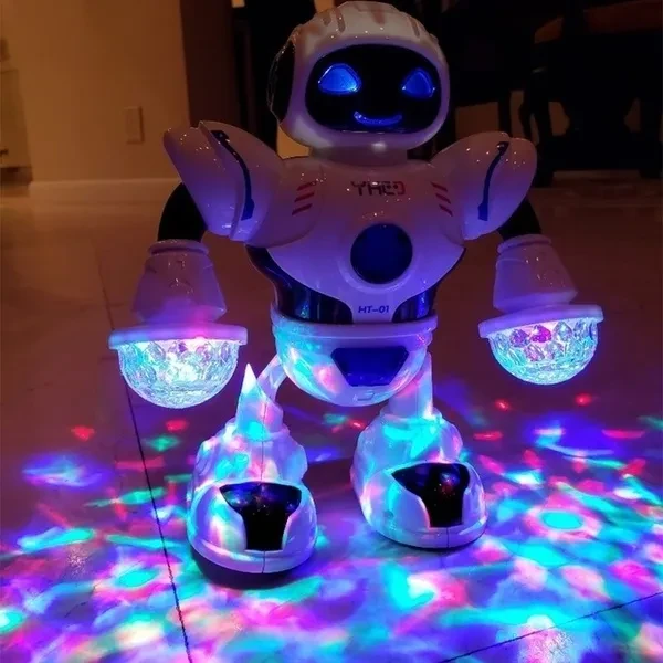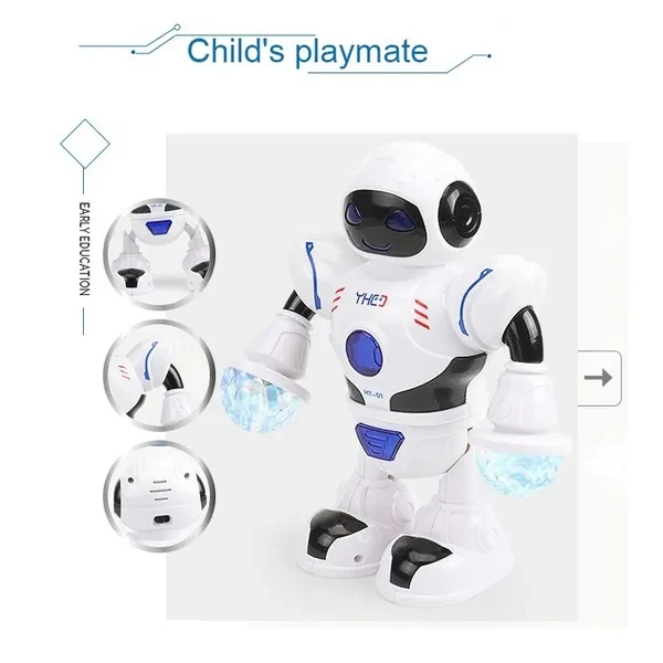 Feature: Cool flash lights display, it will be more beautiful at night This robot is responsive, moves and rotates with its legs and hand spinning action, arms and legs move with the song(Left and Right) Dual wheel foot balancing, the robot can easily navigate his surroundings Best Christmas gift for your friends and family. Fun dancing robot electronic toys with music lightening toys gift for kids children Specification: Material:Plastic+Electronic component Color:As the picture Gender:Unisex Battery:3*AA(Not included) Product Size:19.5*8*22cm Function:Lights,Music Package Included: 1*Dancing Robot