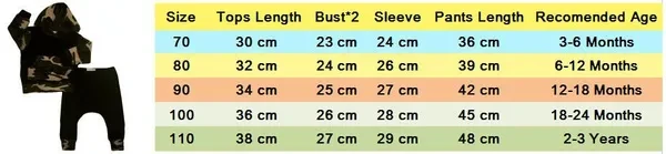 High quality and Brand new 100% Main Color: AS The Picture show New in Fashion Camouflage Style:Casual Material:Cotton Blend Attention plz: If your kid is chubby, we recomend choosing a larger size, thanks. Please kindly refer to your kids actual height and the size chart before buying/bidding. Thanks. Package Included:1x Hooded Tops & 1x Pants Please note that slight color difference should be acceptable due to the light and screen.
