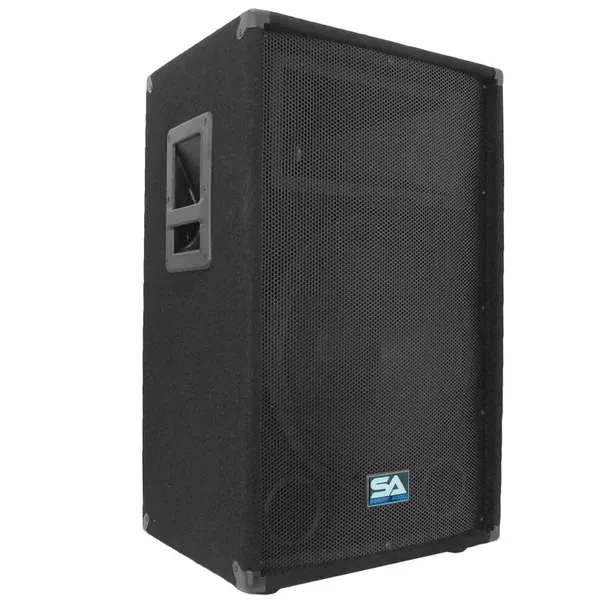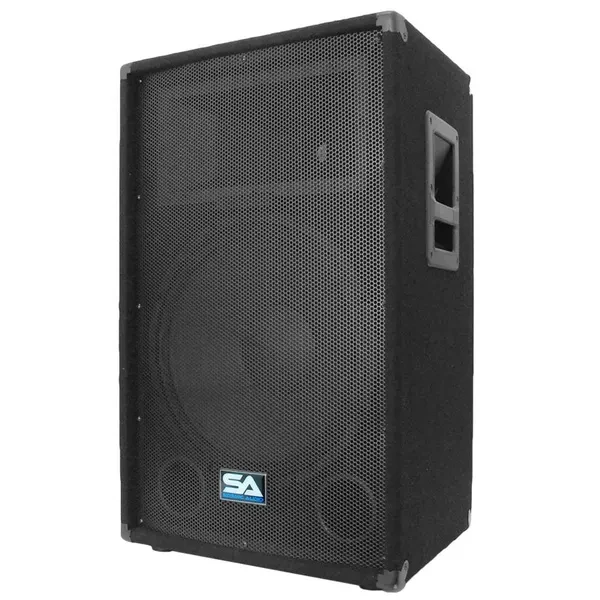 Model - SA-15T  (Set of 2) Woofer - 15" 2 way with a 50oz magnet and a 2.5" kapton voice coil 350 Watts RMS - 700 Watts Peak Wired at 8 ohms 45Hz - 20KHz Sensitivity: 96 db Tweeter: 1.5" Titanium driver with 10z. magnet and 1" throat Crossover: 12/18db per octave 3000hz high power w/ dual glass bulb tweeter protection 5/8 plywood front panel Black carpet with black metal corners Recessed handles Full Metal Grill Input terminal with two 1/4" & two speakon inputs Can be Daisy Chained Dual ports 1.5" meatl tripod speaker stand mount on bottom 28" tall - 18" wide - 15" deep Weight:  52 lbs per cabinet These speakers are brand new. One year warranty
