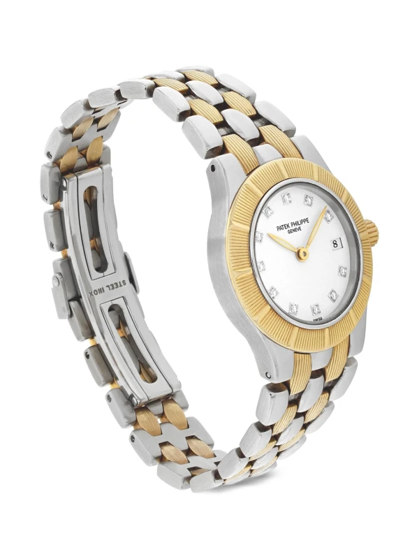 Blanc, or jaune 18ct, boîtier rond, cadran orné de diamants, aiguilles bâton, lunette cannelée, couronne vissée, bracelet à maillons ajustable, boucle déployante, mouvement à quartz. Cet article bénéficie d'un an de garantie standard proposé par la boutique partenaire. Boîte et documents originaux non inclus..