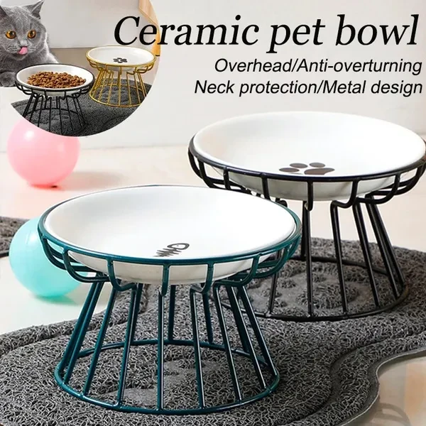 Pet Cats Food Bowl with Stand Protect Pet Neck Anti-slip Dog Food Bowl with Iron Overhead Stand Ceramic Printed Pet Feeder Indoor Pet Care