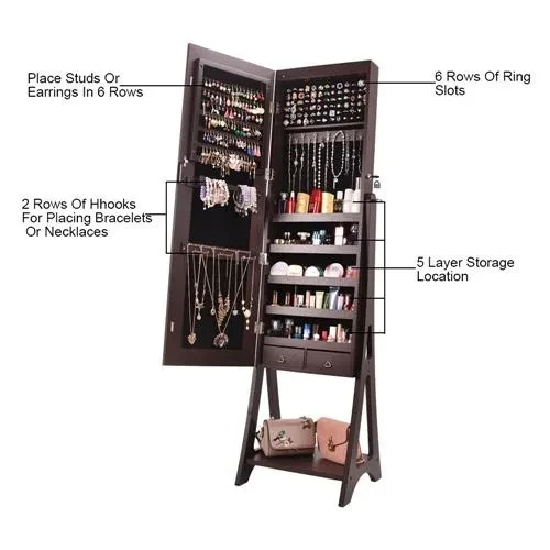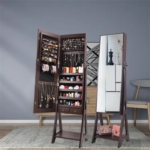 Features: 1. A storage rack for your precious jewelry 2. The mirror is smooth and real 3. New and high quality 4. An excellent gift for your friends 5. Made of durable and reliable density board & glass & velvet material to ensure long time use Specifications: 1. Main Material: P2 High-Density Board, PVC Wood Grain Covered With High-Quality Velvet, Silver Mirror, Built-In 6Led Lamp 2. Color: Brown, Mirror Cabinet Wood Grain, Painted Legs 3. Cabinet Size: (42.52 x 14.57 x 3.94)" / (108 x 37 x 10)cm(L x W x H) 4. Overall Size: (16.14 x 14.57 x 58.27)" / (41 x 37 x 148)cm(L x W x H) 5. Net Weight: 30.86lbs / 14kg Package Includes: 1 x Specification 1 x Jewelry Mirror Cabinet 1 x Hardware Accessories Bag