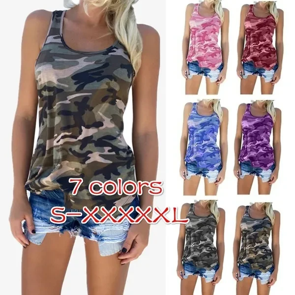 (S-5XL) Women Summer Fashion Print Top Casual Army Camo Camouflage Tank Top Sleeveless O-neck Slim T-Shirts Plus Size