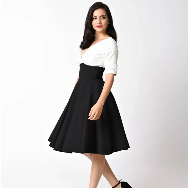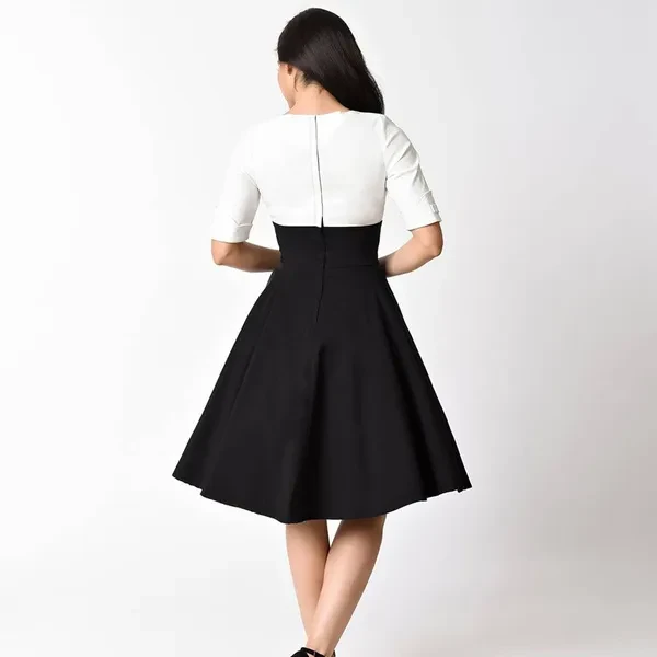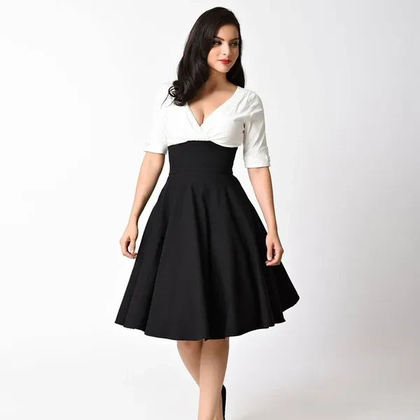 Gender: Women Dresses Length: Knee-Length Pattern Type: Solid Silhouette: A-Line Neckline: V-Neck Season: Spring Model Number: 334 Style: Vintage Waistline: Empire Sleeve Length(cm): Half Decoration: None Sleeve Style: Regular Material: Polyester Size: S,M,L,XL,XXL,3XL Color: Black White