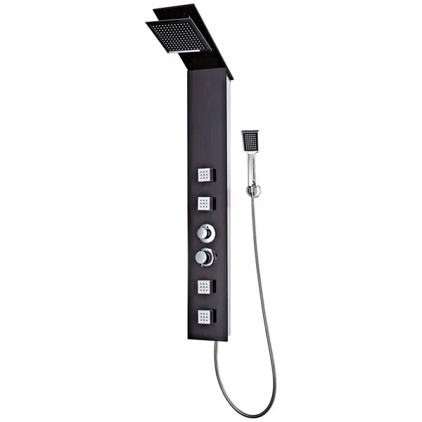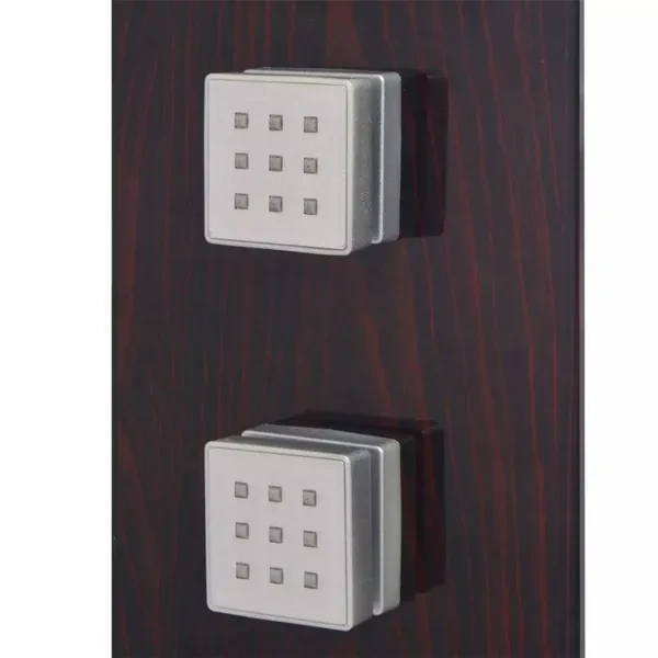 This multifunctional shower panel system has a stylish design and will make a great addition to your bathroom. The shower tower is made of high-quality glass with a beautiful wood grain print. It has three functions: rainfall, massage jets and a handheld showerhead, which can be easily selected by means of a knob. Immerse yourself in a truly relaxing shower experience and enjoy the modern style of this beautifully designed shower panel system! Colour: Brown Panel material: Glass with a wood grain print + chrome-plated plastic The rainfall showerhead, massage jets, handheld showerhead and knobs are chrome plated Dimensions: 18 x 42 x 133 cm (W x D x H) Rainfall shower size: 20.4 x 20.4 cm (L x W) Massage jets size (each set): 5.5 x 5.5 cm (L x W) Handheld shower size: 24 x 7.5 cm (L x W) Stainless steel hose length: 150 cm Functions: Rainfall, 4 sets of body massage jets, handheld showerhead 180 jets with a silicon nozzle each: 144 on the rainfall showerhead and 9 on each set of body massage jets The silicon nozzles are resistant to limescale buildup Standard 1/2" plumbing connection Easy installation