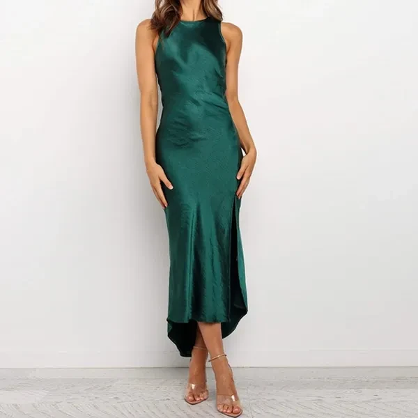 Spring and Summer Fashion Women Sling Dress New Solid Color Backless Retro Casual Long Dresses Under Split Ruffled Sleeveless Skirt