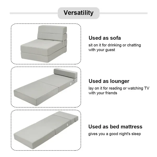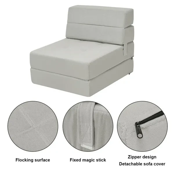 Note:Shipping Exclude these locations: Africa, Asia, Central America and Caribbean, Europe, Middle East, North America, Oceania, Southeast Asia, South America, Alaska/Hawaii/Puerto Rico, US Protectorates, APO/FPO, PO Box This is our brand new tri-fold sofa bed which has a flocking surface and is filled with superior sponges to achieve a more comfortable sitting. Thanks to its innovative quarter-fold design, you can unfold it when you need. Besides a bed, it can also be used as a laid-back lounge or a cozy sofa. In addition, our sofa bed features fixed magic sticks on the two side of the cushion to enhance security when the sofa is used. It is suitable for apartment dwellers, college dorms, family dens and doesn't take up much space. Come and buy it now! You won’t be disappointed! Feature: Brand new and high quality Innovative tri-fold design, easy to storage Flocking surface & sponge filling, more soft and comfortable Used as a comfortable sofa, a laid-back lounge or a cozy bed Great for apartment dwellers, college dorms, family dens, etc Suitable for video gaming, reading a book, watching movie, sleeping,etc With fixed magic stick to enhance security Removable cover for convenient cleaning Specification: Main material: flocked cloth, sponge, polyester wadding Sofa dimension: 28.5”×30.5”×26”(W×D×H) Bed dimension: 77.5”×28.5”×6.5”(L×W×H) Net weight: about 21 lbs Package includes: 1×Sofa Bed 1×instruction