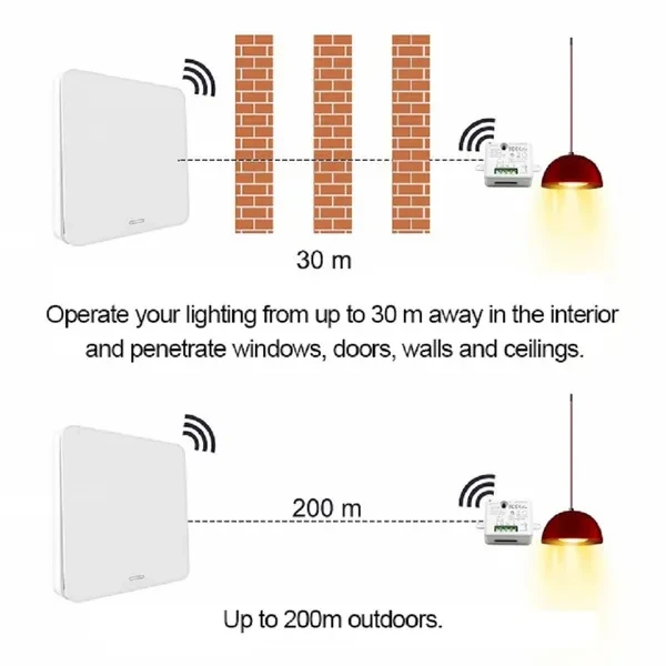 Specification Relay Receiver: Input/Output Voltage: 100-250VAC Max. Load: 10A Size: 47mm*46mm*23mm Wireless Switch(Remote) Power Type: Self-powered, No battery needed Work Type: Push Button Size: 86mm*86mm*15mm Features: Remote Control , no wire no extension cables required for the switch, can put it anywhere you need to control the light on off Please note , this item is without WiFi , only RF Self Powered Wireless Switch, No Battery, No Wires Required Long Control Range Indoor 30m , Outdoor 200m No Interference Reliable Wireless type, no intereference to each product , you can use many in the same space Multi switches control the same light How to Install the Receiver Connect the relay receiver between AC Power and light or other device Multi switches control the same light Tiny Size Relay Module Easy to Hide