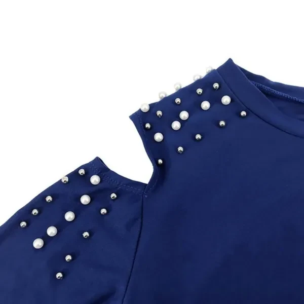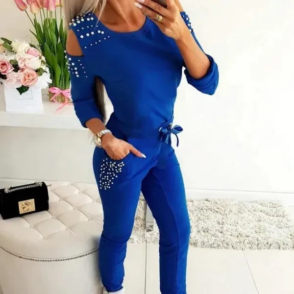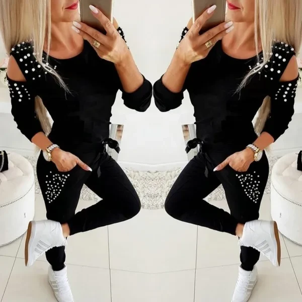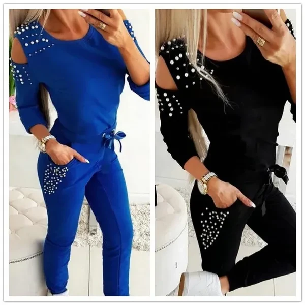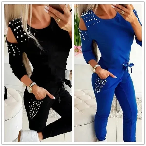 Women's 2-piece sportswear set, casual wear, off shoulder beaded T-shirt, top and pants