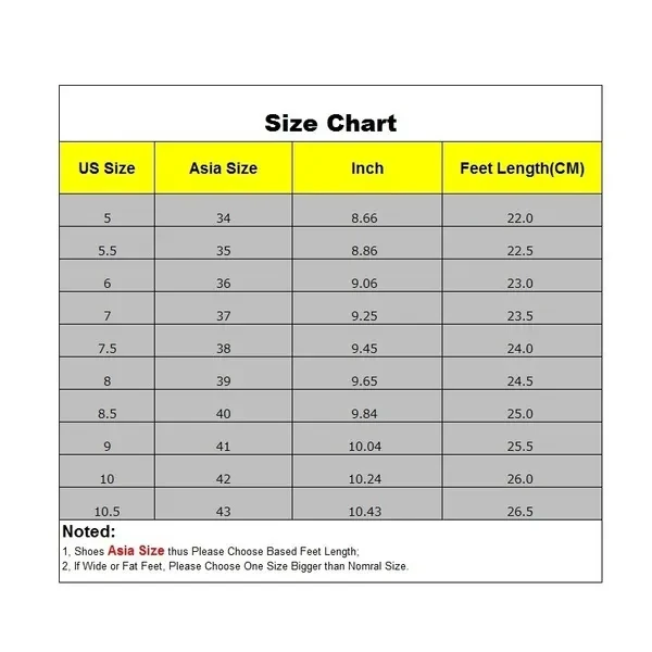 Attention Pls:pls read the following notes before placing the order and choosing the size according to your foot length. Kindly Noted: 1.please choose the shoes based on your foot length. 2.our size is US size, not UK Size, not russia size. 3.if you do not understand our size, please contact us before placing order. US 5.0=CN 34=Feet 22.0cm US 5.5=CN 35=Feet 22.5cm US 6.0=CN 36=Feet 23.0cm US 7.0=CN 37=Feet 23.5cm US 7.5=CN 38=Feet 24.0cm US 8.0=CN 39=Feet 24.5cm US 8.5=CN 40=Feet 25.0cm US 9.0=CN 41=Feet 25.5cm US 10.0=CN 42=Feet 26.0cm US 10.5=CN 43=Feet 26.5cm US 11.0=CN 44=Feet 27.0cm US 11.5=CN 45=Feet 27.5cm US 12.0=CN 45=Feet 28.0cm US 12.5=CN 45=Feet 28.5cm To avoid mistake, Please check above size info. before your order.
