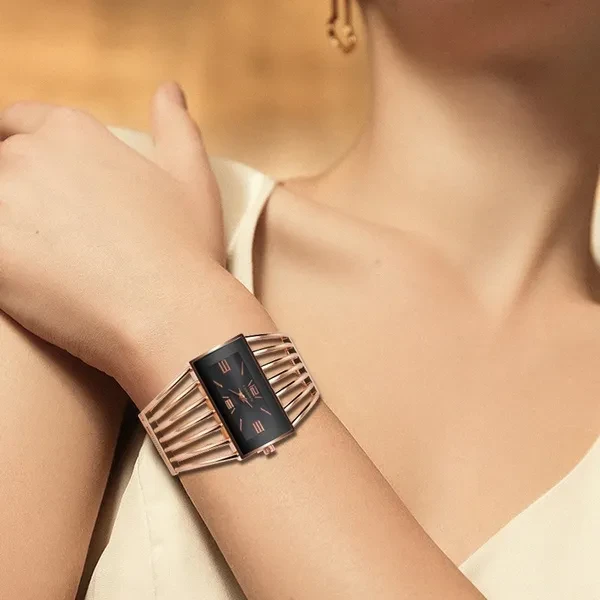Feature: Shock Resistant Band Width: 30mm Movement: Quartz Clasp Type: None Water Resistance Depth: No waterproof Dial Window Material Type: Glass Boxes & Cases Material: Paper Case Shape: Rectangle Case Thickness: 8mm Style: Fashion & Casual Band Length: 19.8cm Band Material Type: Stainless Steel Dial Diameter: 38mm Case Material: Stainless Steel Item Type: Quartz Bangle Bracelet watches Watch Style: women luxury watch features: fashion, stainless steel estilo: moda popular/high quality Gender: Women female girls ladies Feminino Women watch: Mujer Saati Relojes Watch color: rose gold/gold/silver Dial color: black and white