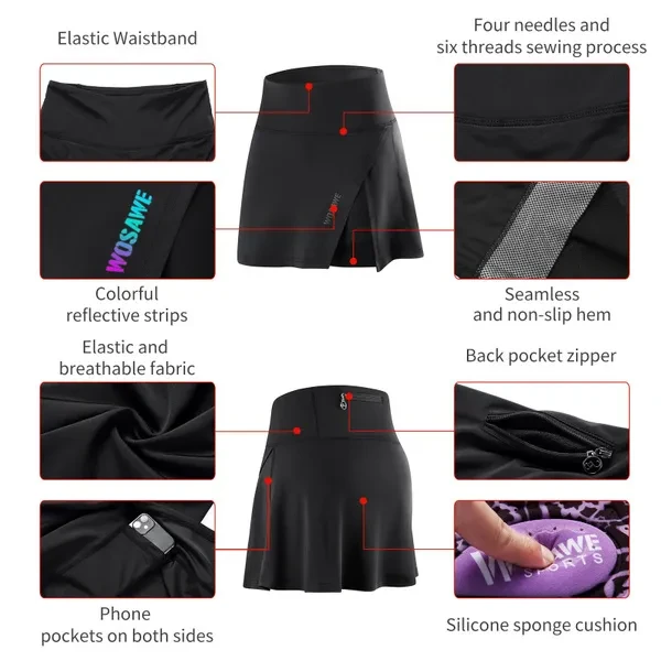Description: WOSAWE Summer Women Cycling Skirt Bike Shorts 2 in 1 Tights Quick Dry 3D Gel Padded Shorts Product Features: Back zipper pocket Phone pockets on both sides Elastic and breathable fabric Built-in silicone sponge cushion Non-slip leg strap Iridescent reflective logo Four needles and six threads sewing process Package Included: 1 x Women Cycling Skirt Shorts Specification: Name: Cycling Skirt Shorts Gender: Women Colour: Black Style: Skinny Size: XS,S,M,L,XL Material:Polyester,Spandex Weight: Application: Cycling, Running, Hiking,Training, Spinning and other outdoor sports