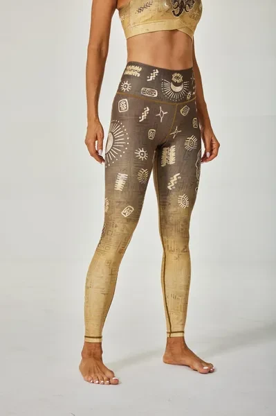 Pattern Description: Inspired by the ancient culture, the print beautifully depicts an array of ancient and mystical symbols including 'water,' 'sun,' 'eye,' 'moon,' and 'stars,' seamlessly intertwined with ancient elephants elements. Set against a gradient background of rich golden hues with a nostalgic feel, this design becomes the top choice for yoga and meditation enthusiasts. It encapsulates a profound sense of connection with the past and a timeless, spiritual essence, making it a meaningful choice for those seeking deeper mindfulness and tranquility in their practice. Product Features: High-waisted design perfectly shapes, supports and flatters any body types No small elastic band at the top A hidden pocket at the back No side seams for extra flattering fit and comfort Pair it with our matching Aureus Bra for a totally unique and dreamy look Fabric: Made with 84% RPET and 16% spandex from recycled plastic bottles and it is 100% recyclable! - Four-way stretch, breathable and anti-bacterial. Model Info: Natali// Height: 5'7// Bust 34.3” // Waist 24.4” // Hips 36.6//SILVERWIND size Regular S Poli//Height: 5'7 // Bust 33.5” // Waist 23.6” // Hips 35” //SILVERWIND size Regular S